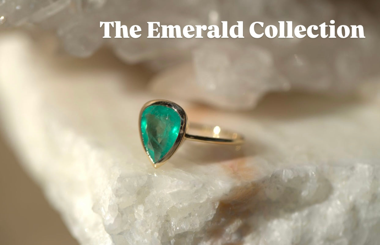 Colombian emerald (cushion cut). White diamonds (full cut). 14k gold (select color). Made in Santa Monica,CA.
